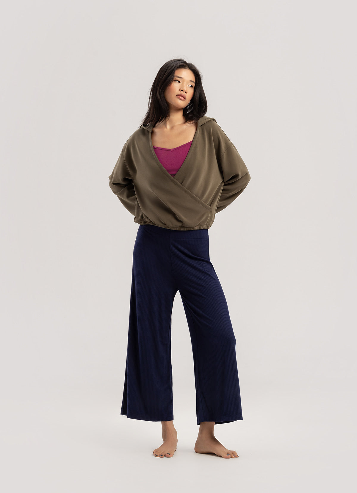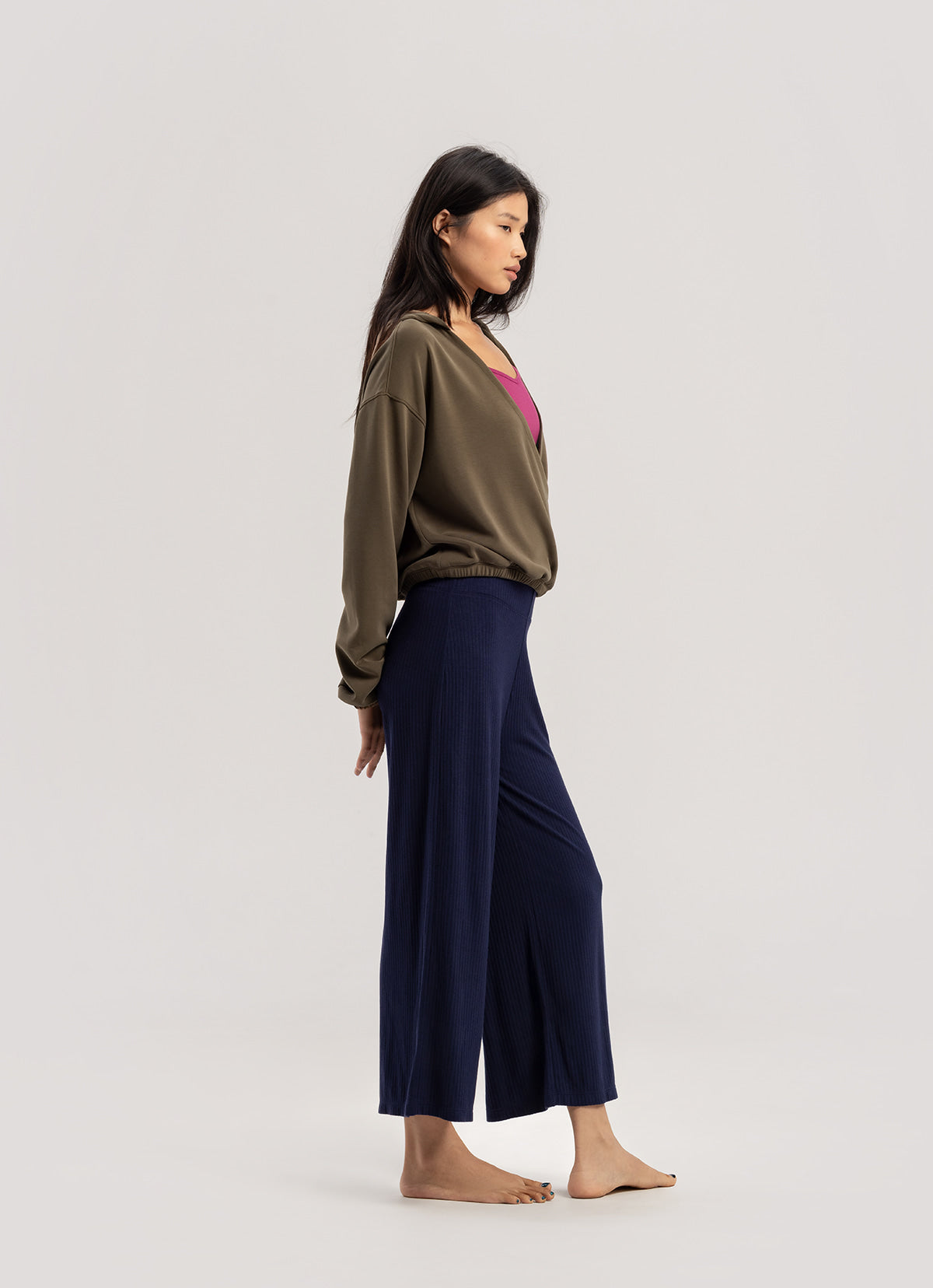 - ワイドなリブ組織と、ウエスト部のシャーリングディテールがポイント